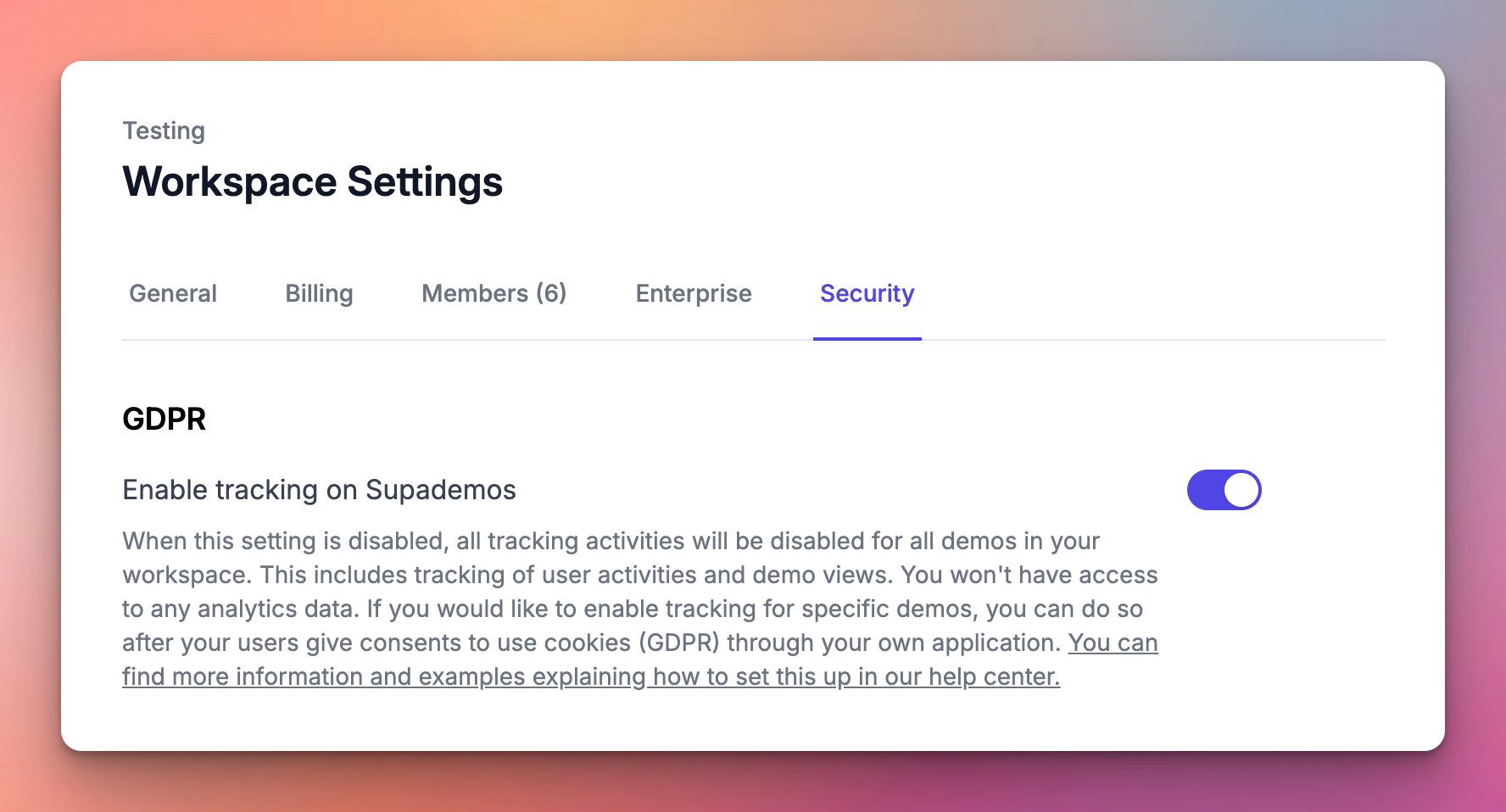 Disabling the "Enable tracking on Supademos" option means Supademo ceases to record actions like user clicks and views on pages within Supademo, rendering such analytics data unavailable in the Supademo Analytics section. This can be accessed through the Security tab under Settings.