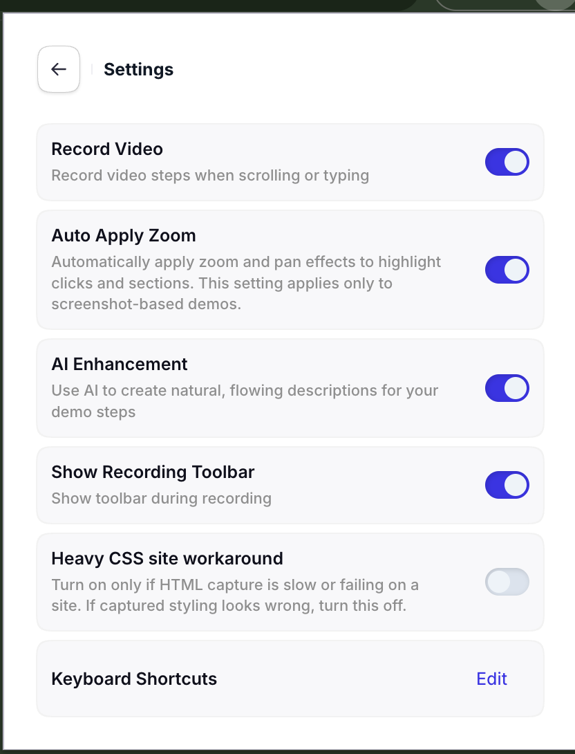 While the recording flow feels familiar, HTML demos include everything screenshot and video-based demos offer — screen and camera recording, image uploads, and video playback — and go further with: